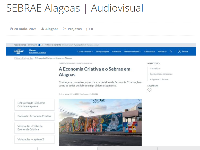 O Alagoar, iniciativa independente voltada à preservação da memória, à difusão e à formação audiovisual em Alagoas lançou em seu portal um espaço com o histórico de atuação do Sebrae com o setor no estado. Na página, também é possível ver uma linha do tempo recordando algumas das ações e iniciativas promovidas pelo Sebrae desde 2018 em apoio ao setor.