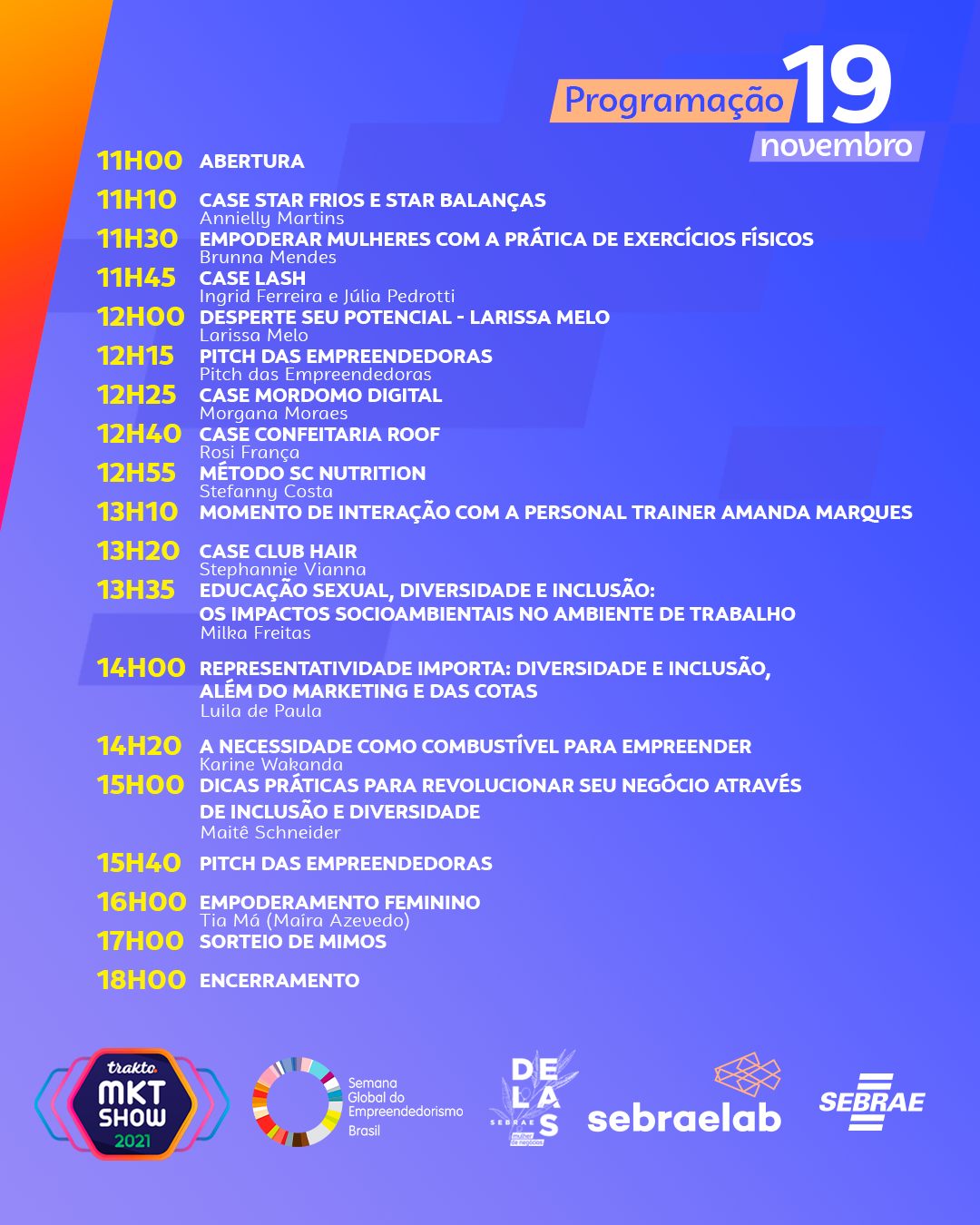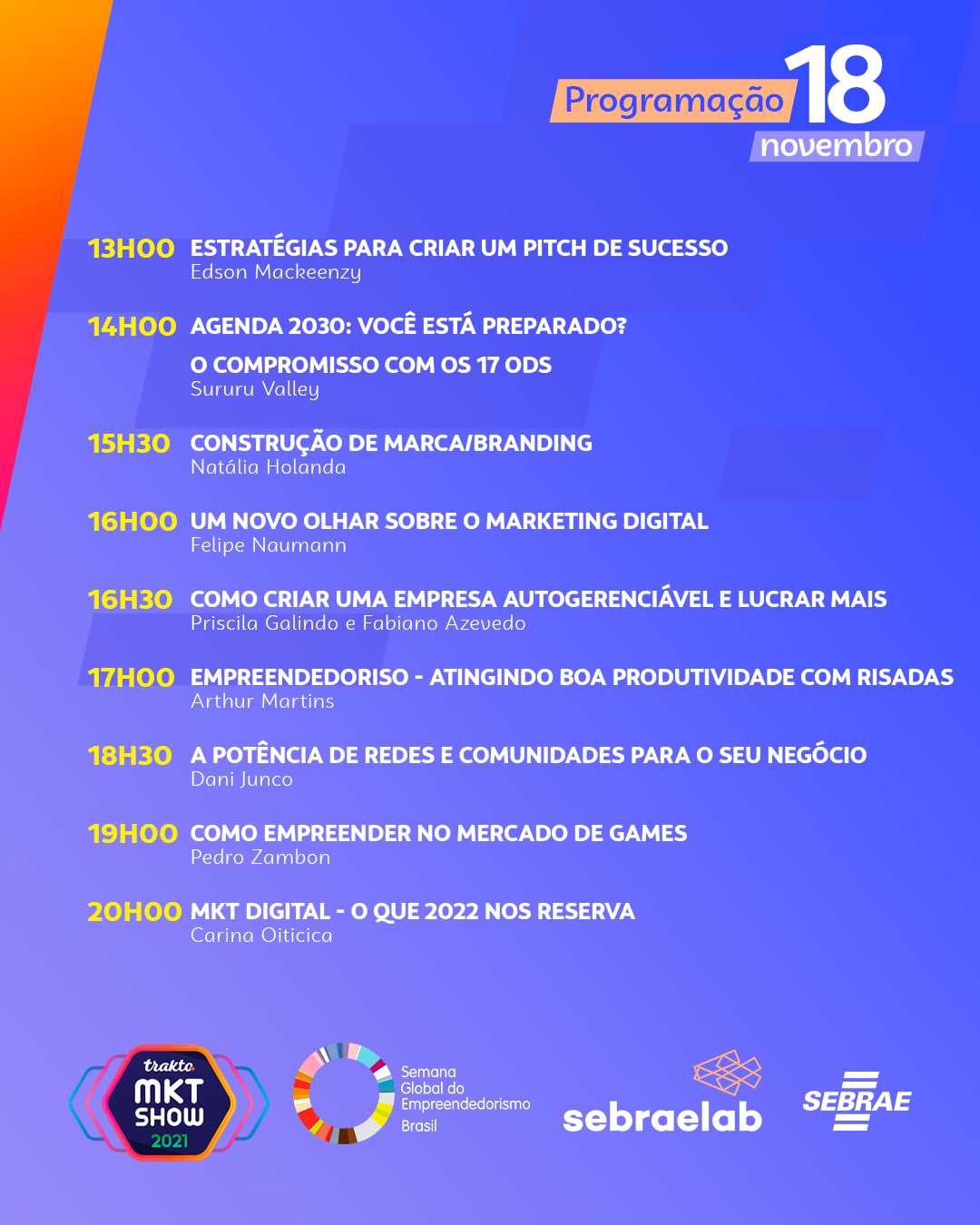 No dia 18, a partir das 13h, a Arena Sebraelab trará Edson Mackeenzy para ministrar a palestra ‘Estratégias para criar um pitch de sucesso’. Na sequência, às 14h, representantes do Sururu Valley irão discutir o tema ‘Agenda 2030: você está preparado? – O compromisso com as 17 ODS’. Às 15h30, Natália Holanda irá apresentar palestra sobre construção de marca e branding. Às 16h será a vez de Felipe Neuman com o tema ‘Um novo olhar sobre marketing digital’. Às 16h30, Priscila Galindo e Fabiano Azevedo irão debater sobre empresas autogerenciáveis. A programação da tarde será finalizada por Arthur Martins, com a palestra ‘EmpreendedoRISO – Atingindo boa produtividade com risadas’.