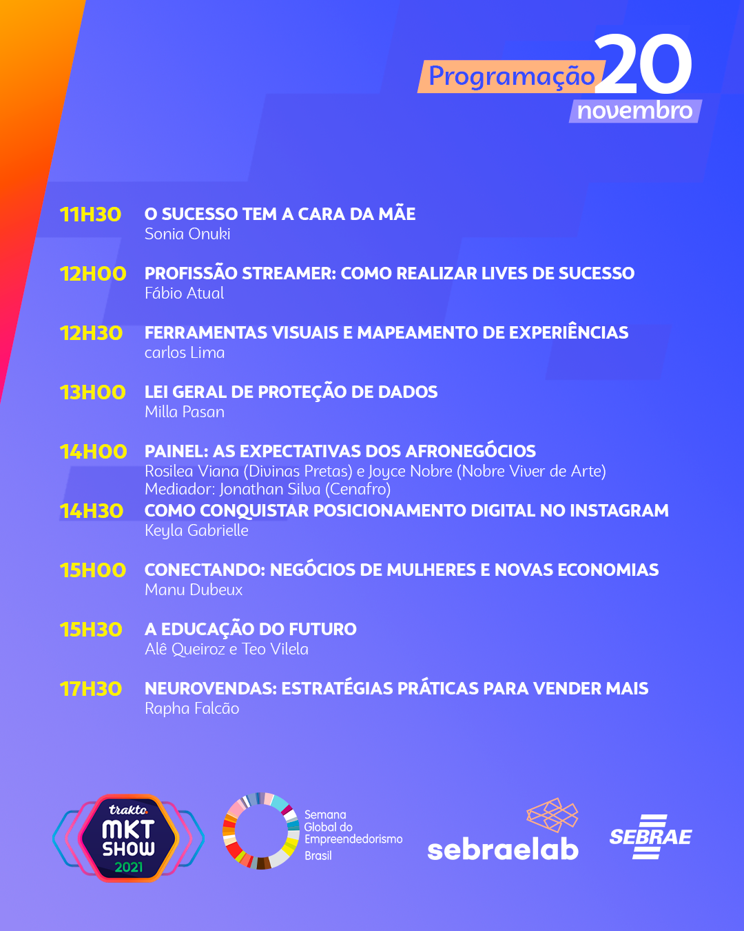 No último dia do Trakto MKT Show, a Arena Sebraelab será aberta às 11h30 com a palestra ‘O sucesso tem a cara da mãe’, apresentada por Sonia Ounuki. Às 12h, Fábio Atual dará dicas sobre a “Profissão Streamer – Como realizar lives de sucesso’. Às 12h30, Carlos Lima ministra a palestra ‘Ferramentas Visuais e o Mapeamento de Experiências’. Às 13h, Mila Pasan traz o tema ‘Lei Geral de Proteção de Dados’. Às 14h, será a vez de Janine Rodrigues com o case da ‘Piraporiando’.