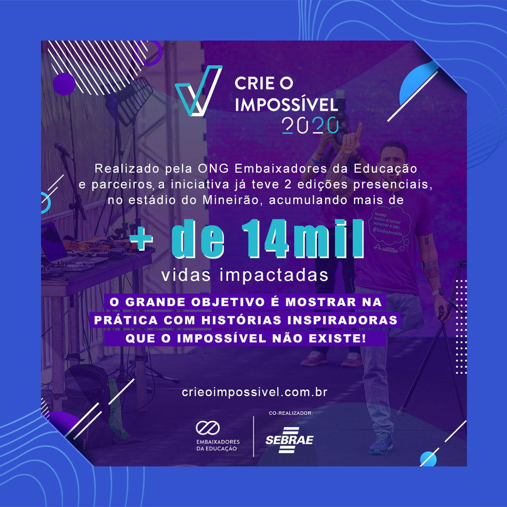 A terceira edição do Crie o Impossível, iniciativa da organização sem fins lucrativos Embaixadores da Educação que conta com a co-realização do Sebrae, já tem data agendada: será no dia 30 de julho, a partir das 16h. Neste ano, em razão da pandemia do novo coronavírus, o evento será completamente online e aberto a todos os públicos. As inscrições são gratuitas e podem ser realizadas por meio do endereço eletrônico www.crieoimpossivel.com.br.