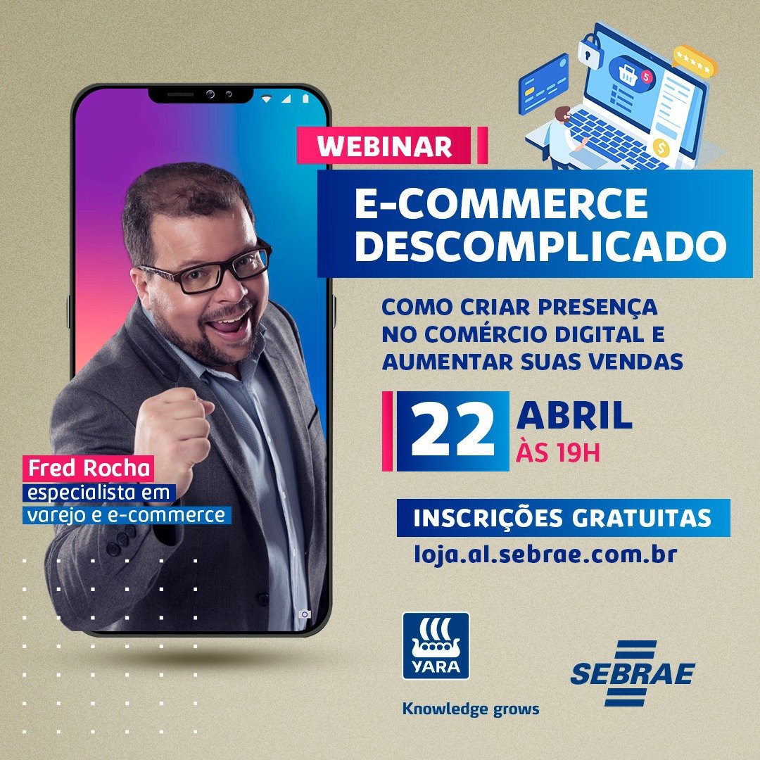As inscrições para o ‘E-commerce Descomplicado – Como criar presença no comércio digital e aumentar suas vendas’ são gratuitas e podem ser feitas na Loja Virtual do Sebrae Alagoas através do link: https://loja.al.sebrae.com.br/loja/evento/132120459-e-commerce-descomplicado-como-criar-presenca-no-comercio-digital-e-aumentar-suas-vendas. O evento é promovido em parceria com a Yara Brasil.