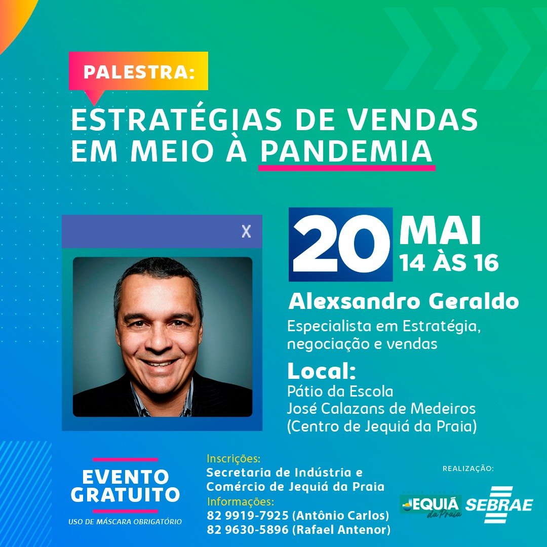 Os empreendedores do município de Jequiá da Praia, a 65 quilômetros de Maceió, vão poder participar de uma palestra gratuita na próxima quinta-feira (20) com foco no aumento das vendas durante a pandemia de Covid-19. O especialista em Estratégia, Negociação e Vendas, Alexsandro Geraldo, é quem vai falar para o público, no pátio da escola José Calazans de Medeiros, no Centro da cidade, das 14h às 16h.