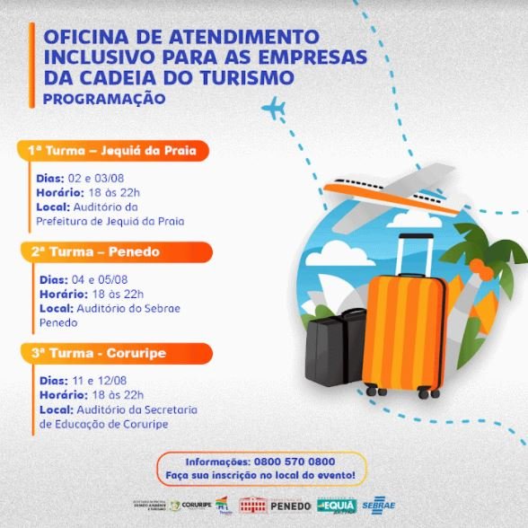 As empresas envolvidas na cadeia do turismo nos três municípios irão receber um formulário do Sebrae para inscrições. A realização das Oficinas de Atendimento Inclusivo para as empresas da Cadeia do Turismo é promovida pelo Sebrae Alagoas em parceria com as prefeituras municipais de Coruripe, Jequiá da Praia e Penedo e de todo o trade turístico da região.