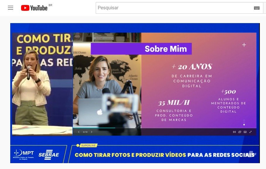 As melhores dicas de como fazer fotos e vídeos criativos, e com uma ‘pegada’ profissional para emplacar nas redes sociais, foi o tema da superlive ‘Como Tirar Fotos e Produzir Vídeos Para as Redes Sociais’. A transmissão foi ao ar durante as noites de terça (21) e quarta-feira (22) com as orientações de Rapha Dorvillé, especialista em marketing de conteúdo (branded content), da fotógrafa Isadora Castro e dos videomakers Huebert Missano e Thays Gabrielle. Para quem perdeu as duas noites da Live, a transmissão agora está disponível no canal do Sebrae Alagoas no YouTube, no endereço youtube.com/sebraealagoasoficial.
