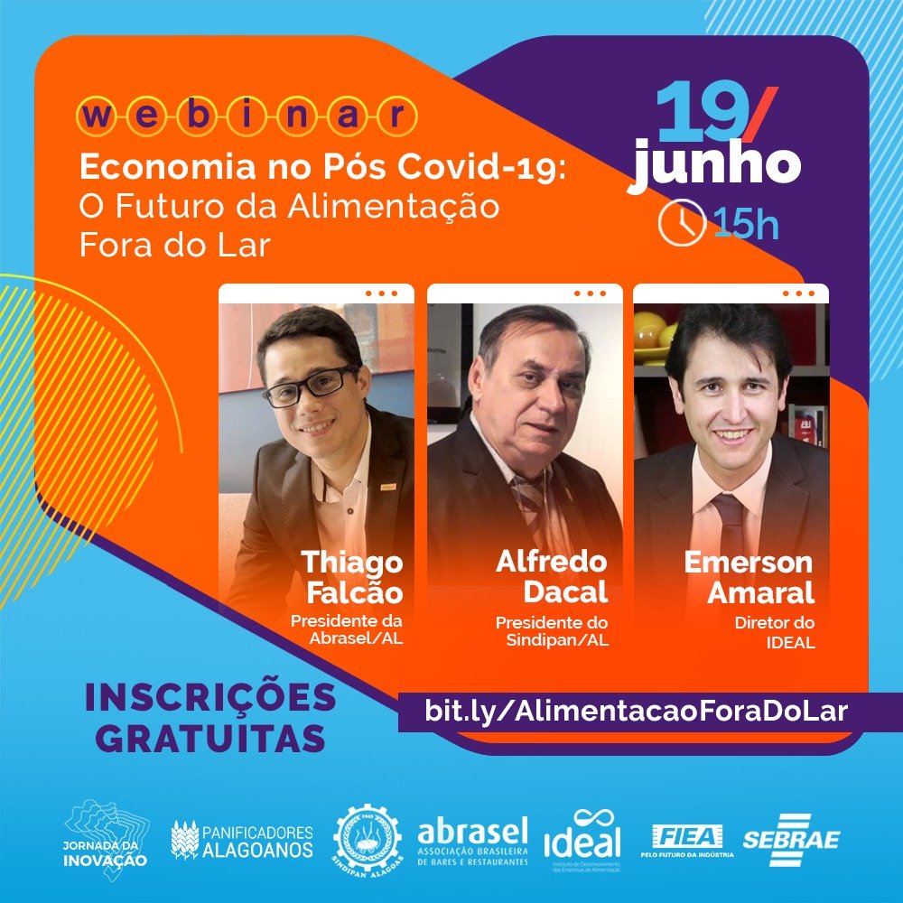 O evento digital contará com a participação do presidente da Associação Brasileira de Bares e Restaurantes em Alagoas (Abrasel/AL), Tiago Falcão, do presidente do Sindicato da Indústria de Panificação e Confeitaria, Bolos, Bolachas, Biscoitos e Massas Alimentícias do Estado de Alagoas (Sindipan/AL), Alfredo Dacal, e do diretor do Instituto do Desenvolvimento das Empresas de Alimentação (IDEAL), Emerson Amaral.