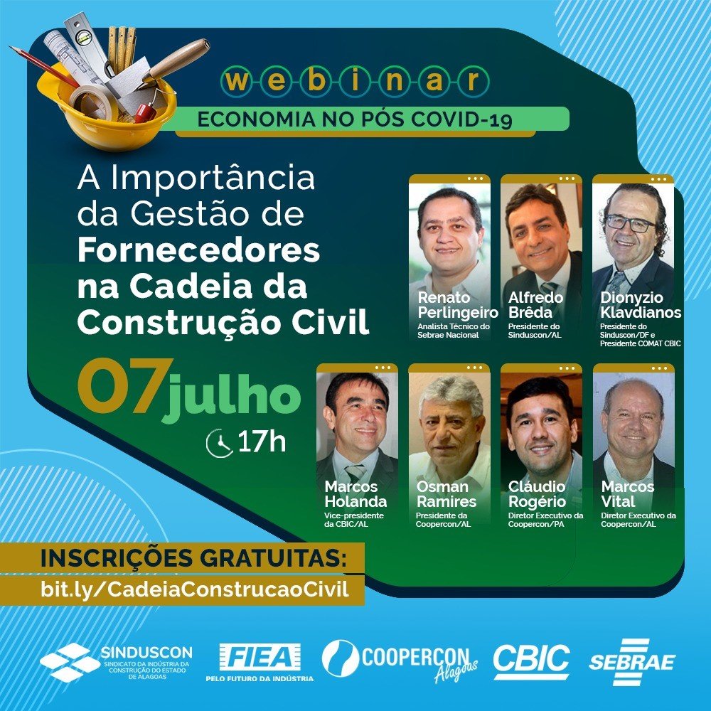 “A Importância da Gestão de Fornecedores na Cadeia da Construção Civil” é o tema do webinar que o Sebrae em Alagoas realizará nesta terça-feira (7), a partir das 17h. O evento digital, que integra a série especial sobre o cenário econômico do pós-pandemia, contará com a participação de sete especialistas do setor da construção civil. As inscrições são gratuitas e podem ser realizadas na página da Loja Virtual do Sebrae Alagoas, por meio do endereço eletrônico https://bit.ly/2Azq2Xj.