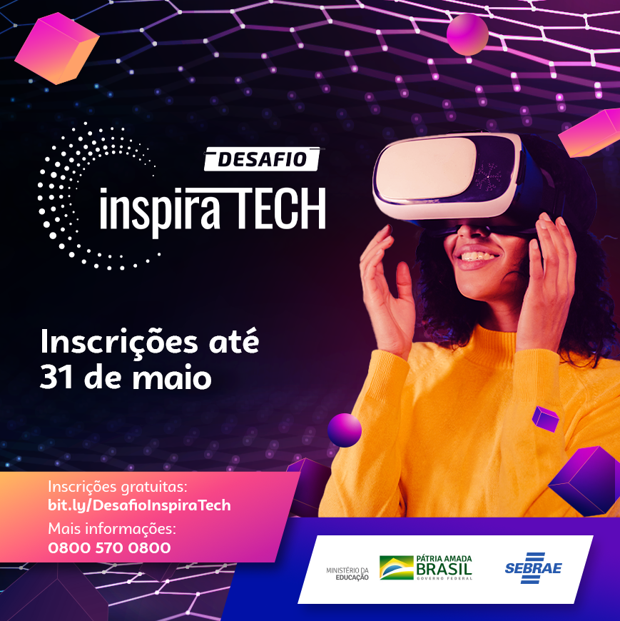 As inscrições para o Desafio Inspira Tech, criado pelo Sebrae e Ministério da Educação (MEC) para promover a cultura e a educação empreendedora na educação formal, foram prorrogadas e vão até o dia 31 de maio. As inscrições podem ser feitas gratuitamente através do site: https://www.even3.com.br/inspiratech/.