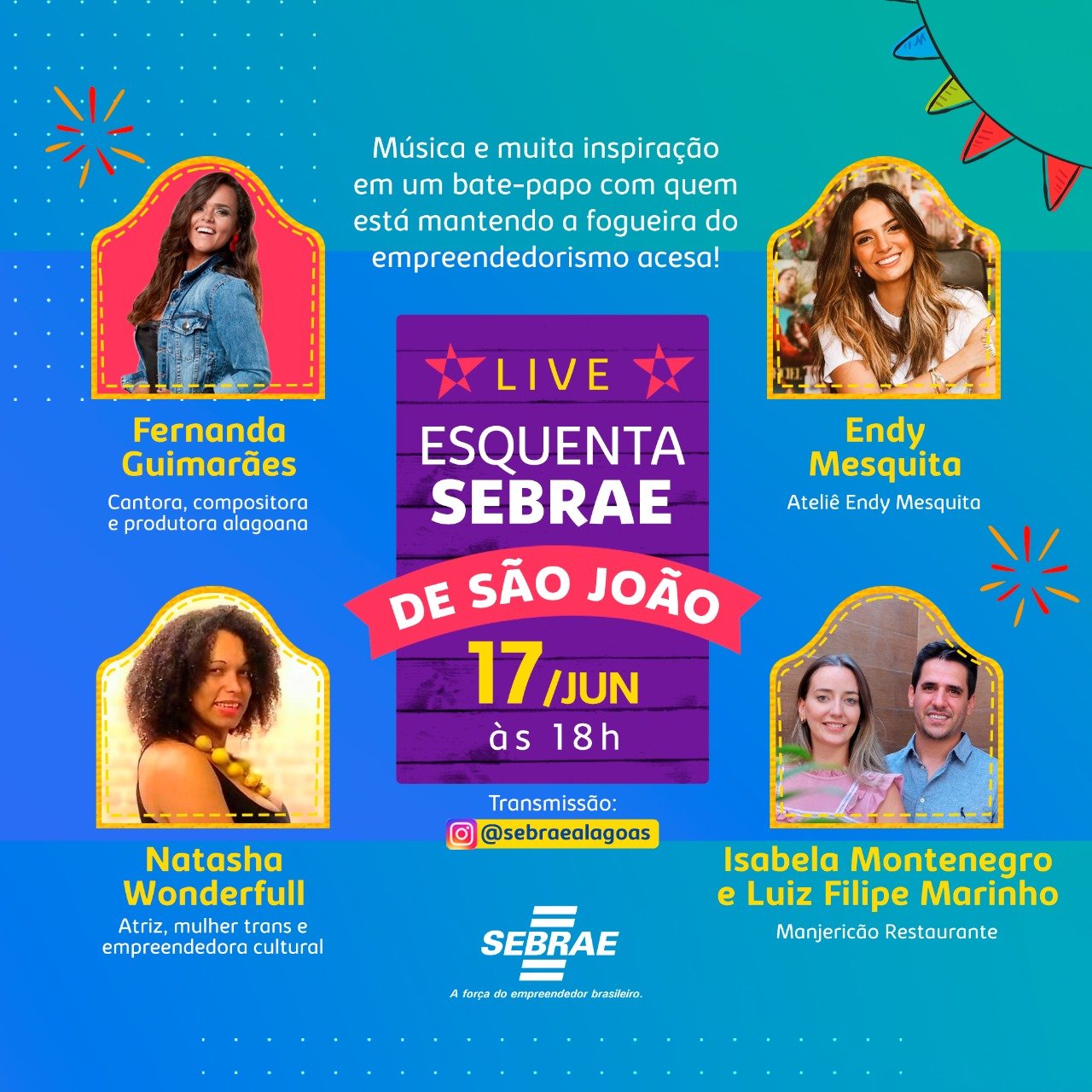O distanciamento social imposto pela pandemia não vai atrapalhar a agenda de São João que o Sebrae Alagoas preparou para os empreendedores. Na próxima quinta-feira (17), a Live Esquenta Sebrae vai ao ar com alguns convidados especiais, entre eles a cantora, compositora e produtora alagoana Fernanda Guimarães, a atriz e empreendedora cultural Natasha Wonderfull, a empresária Endy Mesquita (do Ateliê Endy Mesquita) e os empresários Luiz Filipe Marinho e Isabela Montenegro (do Manjericão Restaurante).