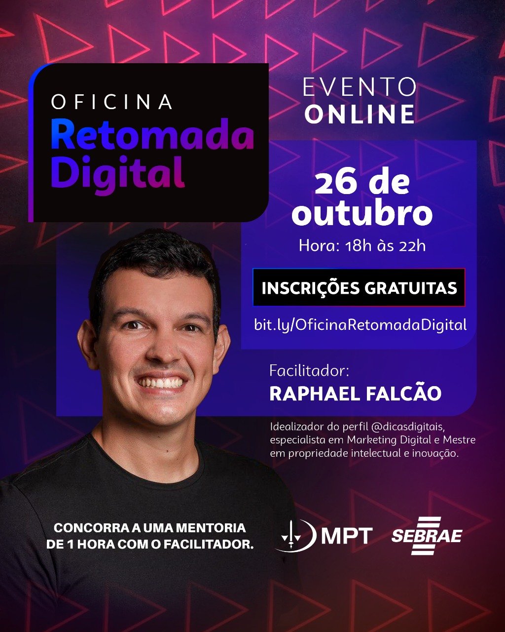 As inscrições podem ser feitas de forma gratuita no endereço https://bit.ly/OficinaRetomadaDigital. No final do evento, também será definido qual participante vai ter direito a receber uma mentoria especial com Raphael Falcão.