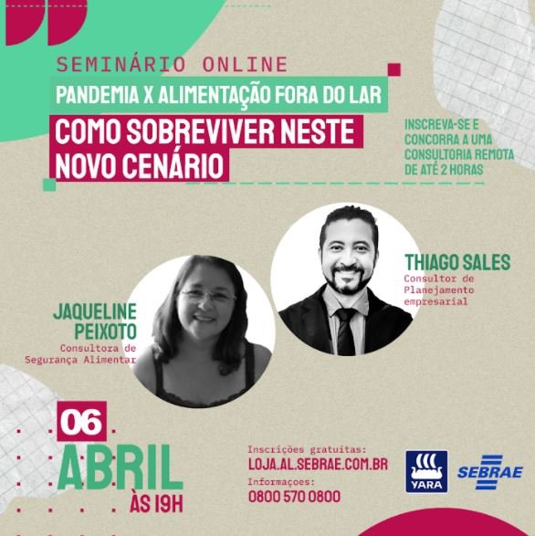 As inscrições para o seminário ‘Pandemia x Alimentação Fora Do Lar: Como Sobreviver Nesse Novo Cenário’ são gratuitas e podem ser feitas pela Loja Virtual do Sebrae Alagoas por meio do link https://bit.ly/3dEdHAu. Os inscritos irão concorrer a uma consultoria remota de até 2h. O evento é promovido em parceria com a Yara Brasil.