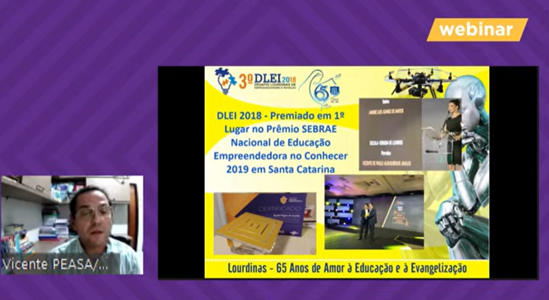 No webinar, dois vencedores da edição 2019 compartilharam seus casos de sucesso. O primeiro deles foi Vicente de Paulo, vencedor da categoria ensino médio, com projeto “Desafio Lourdinas de Empreendedorismo e Inovação”, do Colégio Lourdinas, de Campina Grande/PB.