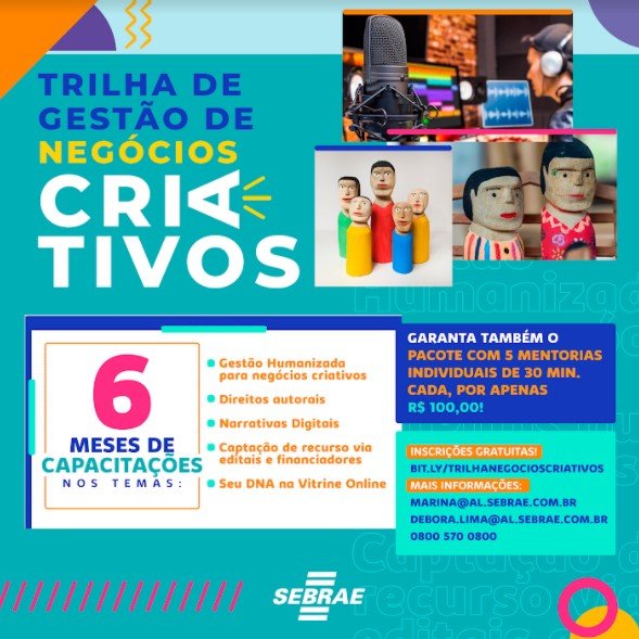 O Sebrae Alagoas lança a partir deste mês de maio, no dia 10, um novo projeto para ajudar no fortalecimento e formação da cultura de inovação entre os empreendedores criativos. É o Trilha de Gestão de Negócios Criativos, que nos próximos seis meses vai realizar encontros gratuitos e online com os inscritos tendo como foco os temas Gestão Humanizada, Direitos Autorais, Narrativas Digitais, Captação de recurso via editais e financiadores, e ainda Seu DNA na Vitrine Virtual.