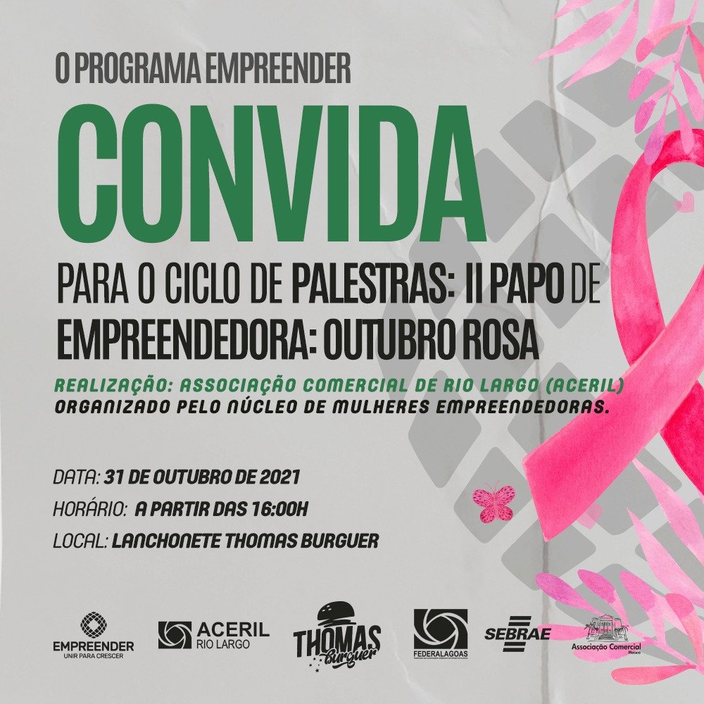 No próximo domingo, dia 31 de outubro, será realizado em Rio Largo o ciclo de palestras “Papo de Empreendedora: Outubro Rosa”. O evento é realizado pela Associação Comercial de Rio Largo (Aceril) e organizado pelo Núcleo de Mulheres Empreendedoras e tem como principal objetivo despertar a conscientização à prevenção do câncer de mama entre as empreendedoras locais. O evento é gratuito e será realizado na Lanchonete Thomas Burger, a partir das 16h.
