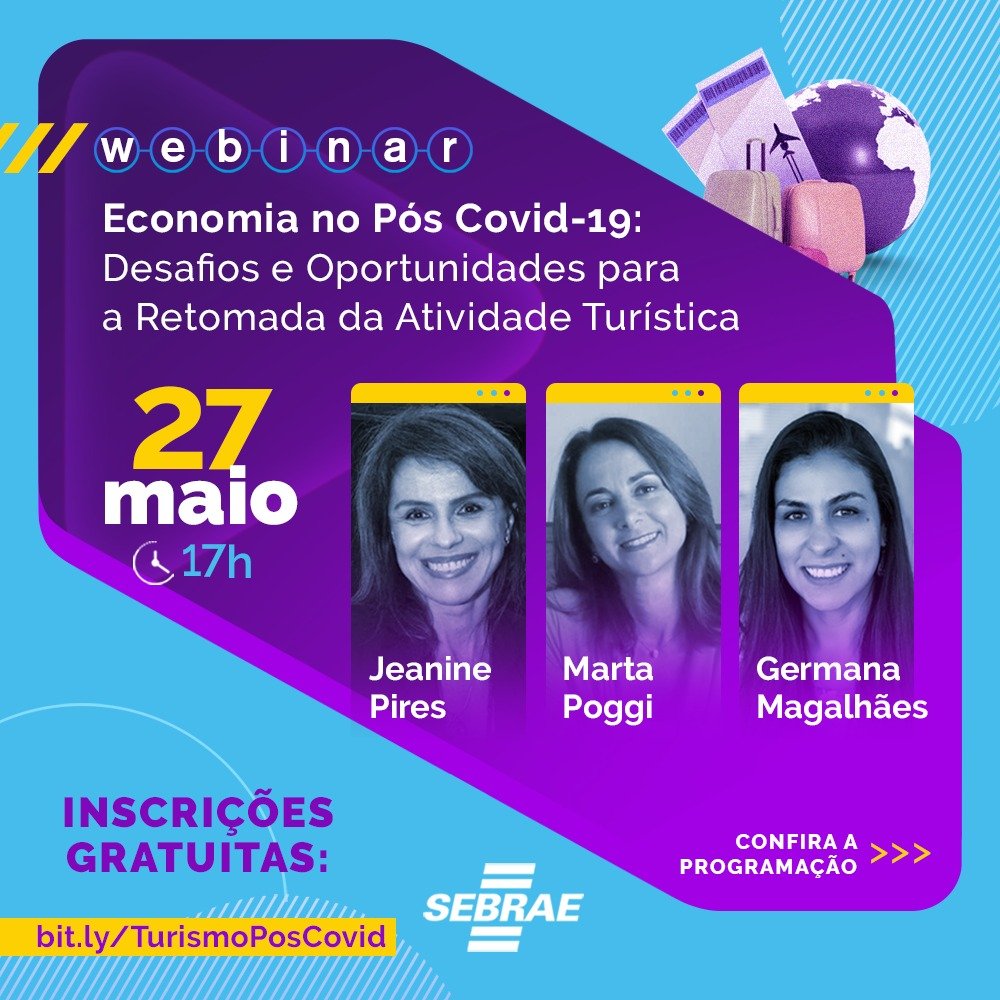 Além de contar com a colaboração de Germana Magalhães, coordenadora do setor de turismo do Sebrae Nacional, que irá abordar o tema “O que fazer enquanto os turistas não podem viajar?”, o evento terá a participação de Marta Poggi, palestrante, consultora, blogueira e conteudista,  falando sobre os “Destinos turísticos inteligentes: experiências, tecnologia e sustentabilidade no cenário pós-Covid”, e de Jeanine Pires, professora, palestrante e diretora da Pires Inteligência em Destinos e Eventos, abordando “O marketing dos destinos turísticos durante a pandemia”.