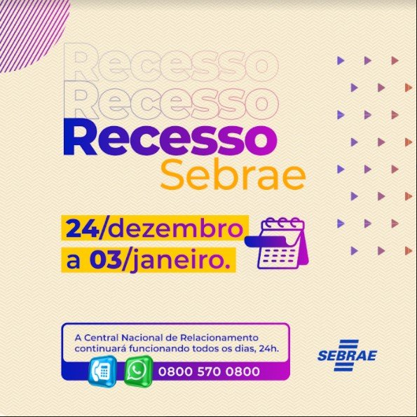 Com a proximidade das festas de fim de ano, Natal e Ano Novo, o Sebrae em Alagoas entra em recesso a partir do dia 24 de dezembro, próxima quinta-feira, e retorna com o atendimento presencial no dia 4 de janeiro, na sua sede, em Maceió e nas Agências de Atendimento Integradas do Sebrae em Arapiraca, Delmiro Gouveia e Penedo, bem como nas mídias sociais no Instagram, Facebook, Twitter, Linkedin e Youtube.