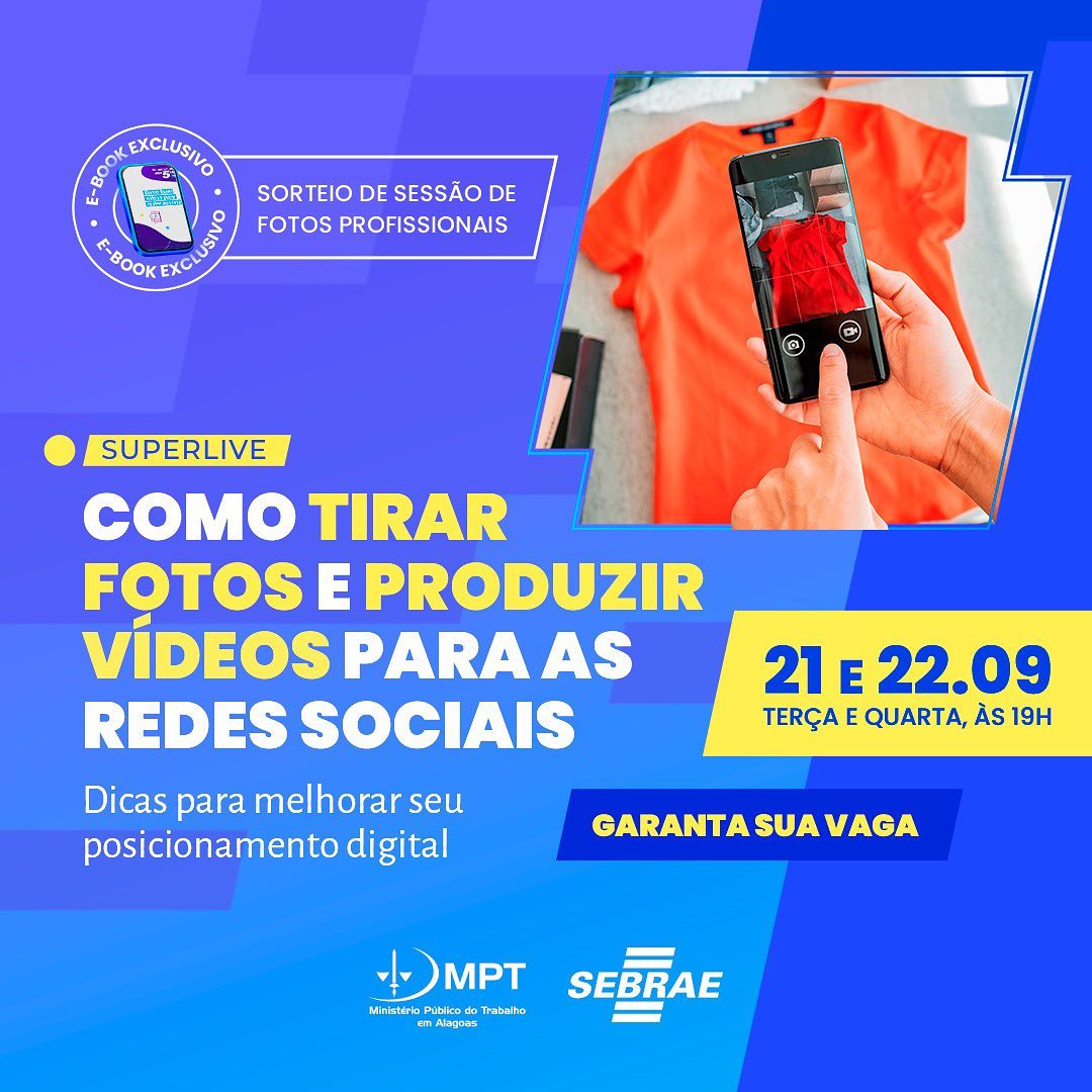 Ter uma boa presença digital é fundamental para os negócios que querem ser mais competitivos, alcançar novos públicos e crescer no mercado. E para auxiliar as micro e pequenas empresas nessa missão, o Sebrae Alagoas promove nos dias 21 e 22 de setembro, a partir das 19h, a superlive ‘Como Tirar e Produzir Vídeos Para as Redes Sociais’. A live é mais uma ação do Projeto Empreenda Maceió, consolidado através do convênio assinado entre o Sebrae e o Ministério Público do Trabalho em Alagoas (MPT/AL).