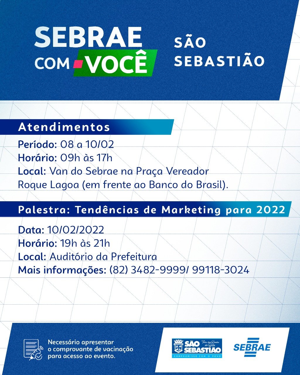 Além dos serviços e orientações nesse local, a programação também conta com uma palestra no dia 10 sobre Tendências de Marketing para 2022, com a especialista da empresa de consultoria credenciada ao Sebrae, Elisângela Macedo. O evento será realizado no auditório da Prefeitura de São Sebastião, parceira do Sebrae nesta ação no município, no horário das 19h às 21h. É necessário apresentar o comprovante de vacinação para acesso ao evento.