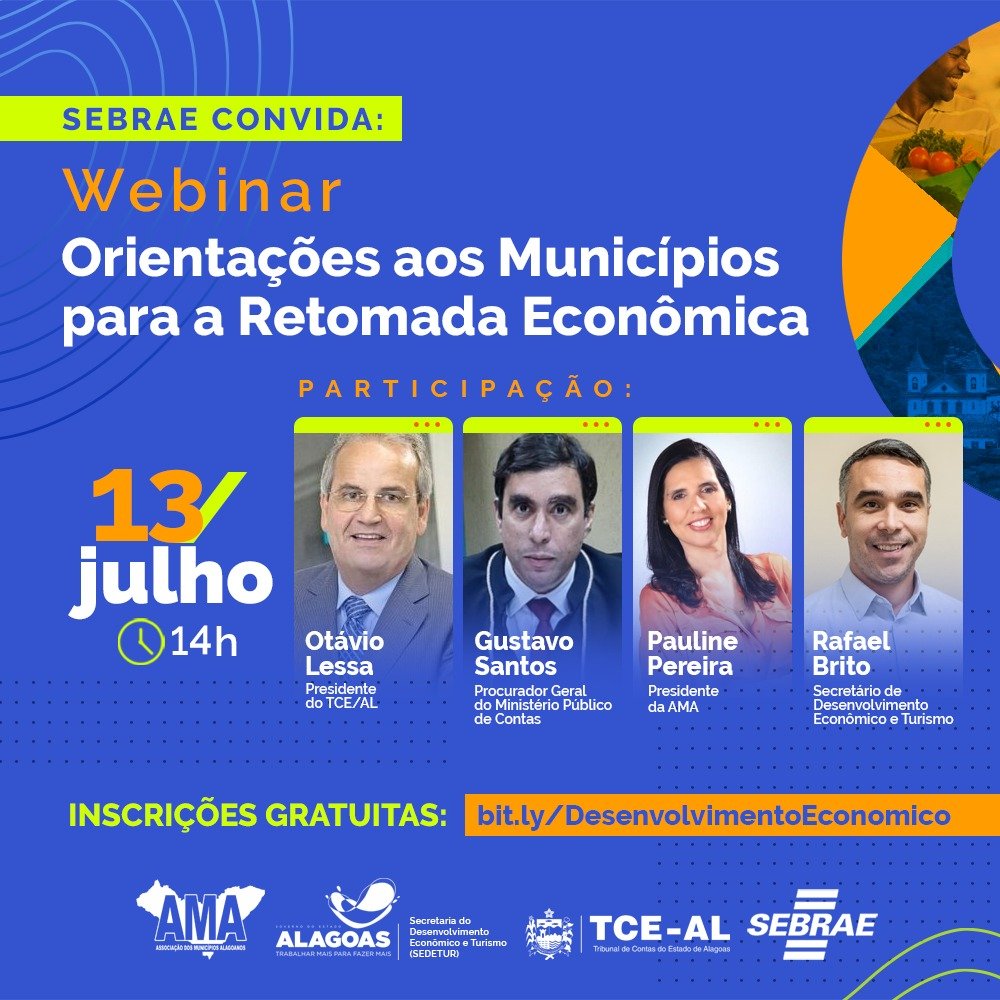 O presidente do Tribunal de Contas do Estado de Alagoas (TCE/AL), Otávio Lessa, o procurador geral do Ministério Público de Contas de Alagoas (MPC/AL), Gustavo Santos, a presidente da Associação dos Municípios Alagoanos (AMA), Pauline Pereira, e o gestor da Secretaria de Estado do Desenvolvimento Econômico e Turismo (Sedetur), Rafael Brito, irão participar da Live “Orientações aos Municípios para a Retomada Econômica”, agendada para a próxima segunda-feira (13), a partir das 14h.
