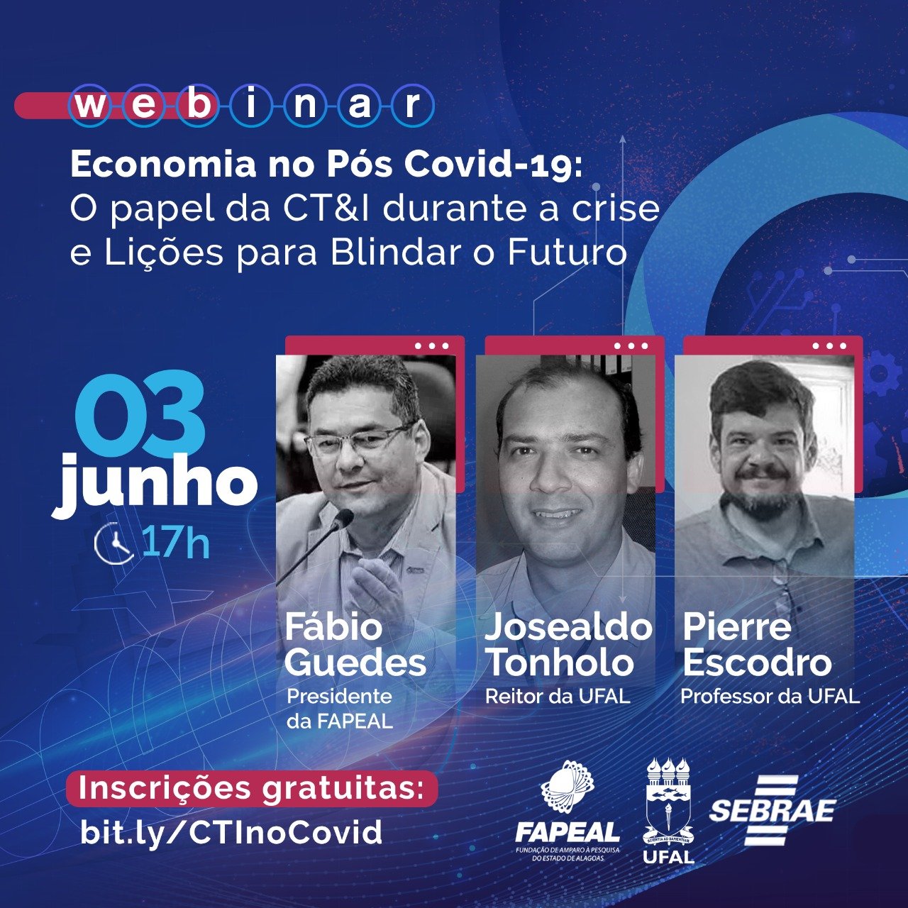 Nesta quarta-feira (3), a partir das 17h, o Sebrae em Alagoas promove um espaço de discussão sobre o papel da ciência, tecnologia e inovação na crise do novo Coronavírus. O webinar, que integra a série especial de eventos digitais realizados pela instituição para discutir a economia no pós-Covid-19, contará com a participação de três professores com ampla experiência sobre o tema.