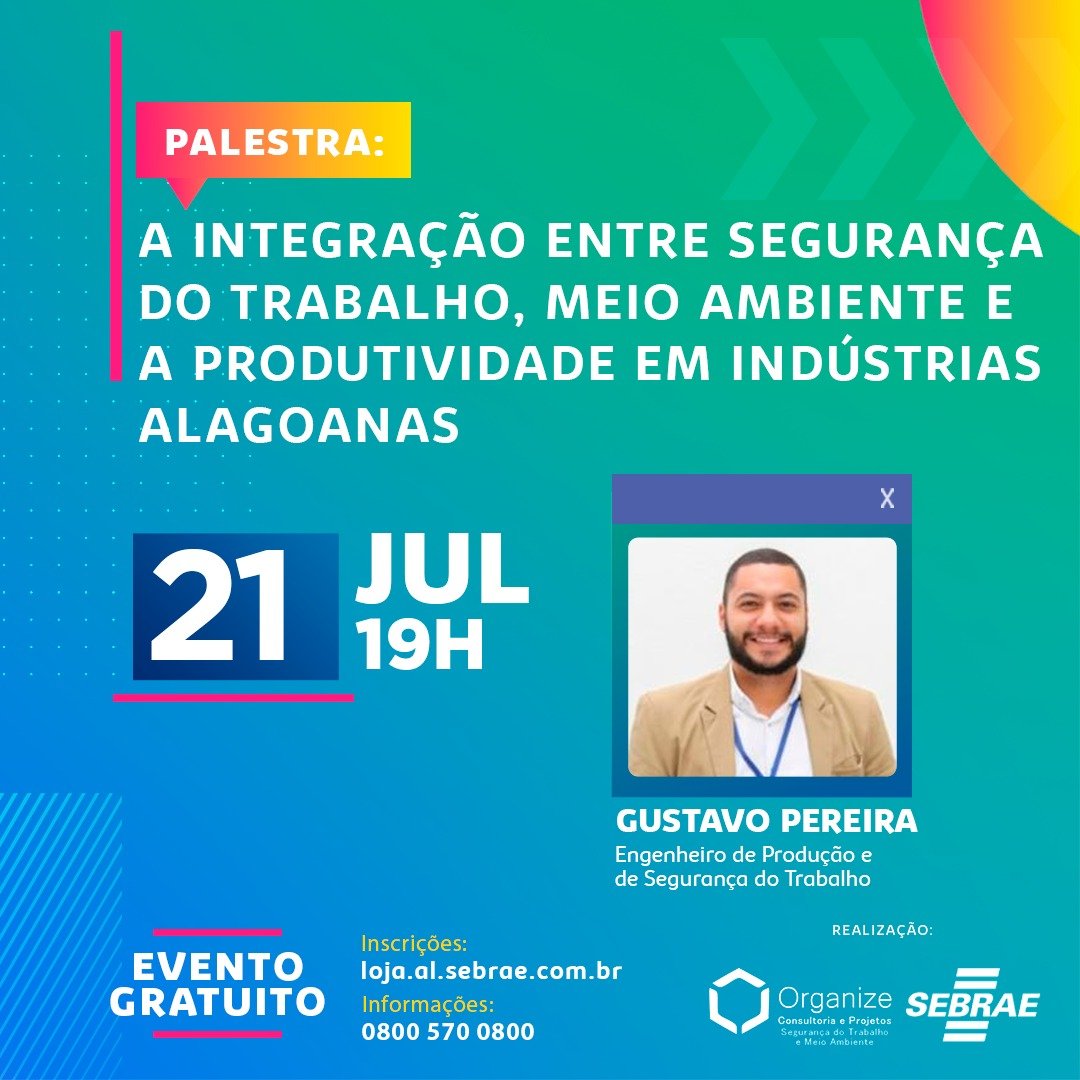 A Segurança do Trabalho está sempre na pauta das empresas que buscam oferecer condições laborais saudáveis para seus funcionários. E para ajudar os empreendedores a manterem boas práticas nesse ponto, o Sebrae Alagoas vai realizar no próximo dia 21 de julho, às 19h, a palestra on-line “A integração entre Segurança do Trabalho, Meio Ambiente e a Produtividade em Indústrias Alagoanas”.