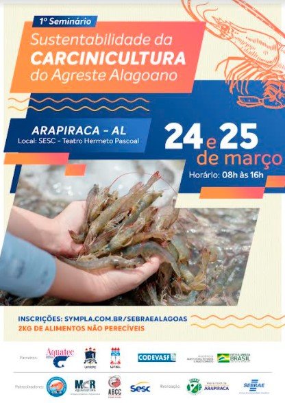 O 1º Seminário de Sustentabilidade da Carcinicultura do Agreste Alagoano é promovido pelo Sebrae Alagoas e Prefeitura de Arapiraca, com o patrocínio da Associação de Carcinicultores Familiares do Agreste Alagoano (ACFAA), MCR Aquacultura, Associação Brasileira de Criadores de Camarão (ABCC) e Serviço Social do Comércio (Sesc Alagoas).