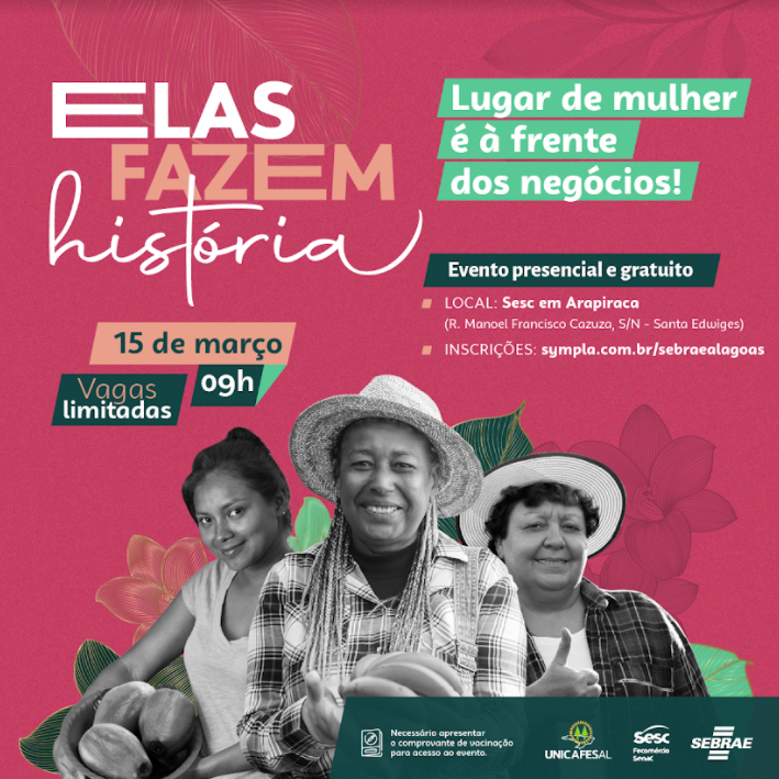 O seminário recebe o apoio do SESC e da UNICAFES/AL – União Nacional das Cooperativas de Agricultura Familiar e Economia Solidária em Alagoas. As inscrições para o ‘Seminário Elas Fazem História – Arapiraca’ podem ser feitas gratuitamente através do site: https://www.sympla.com.br/seminario-elas-fazem-historia—arapiraca__1495685. As vagas são limitadas.