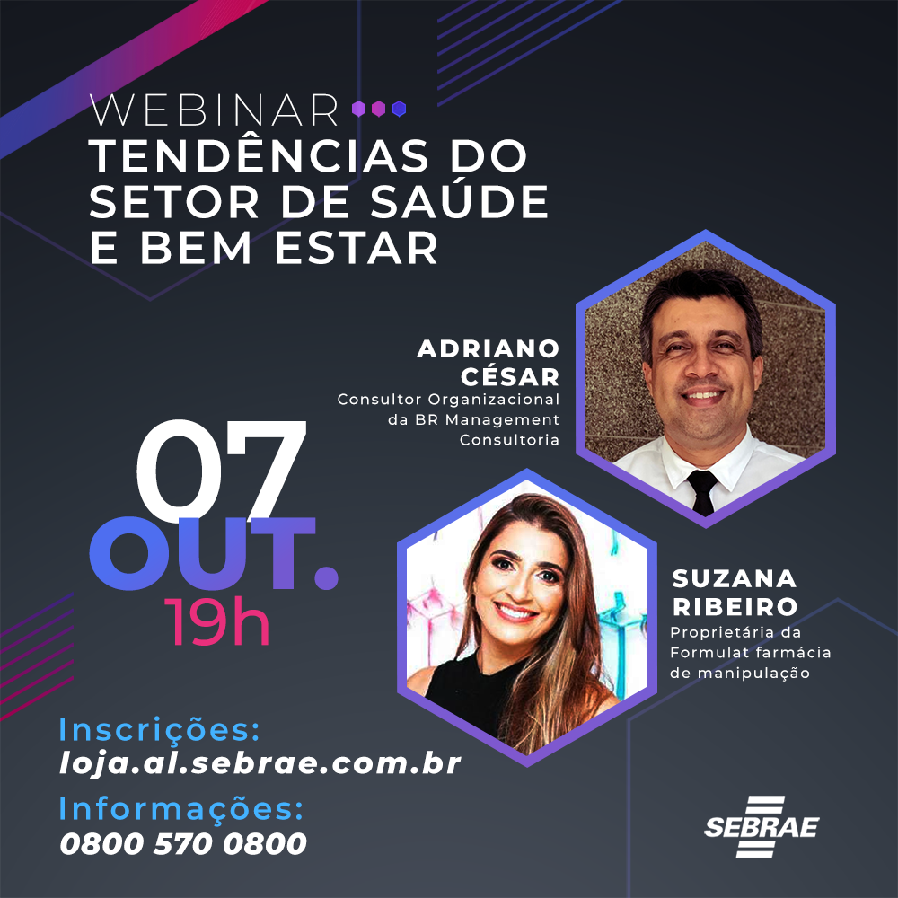 Com o intuito de viabilizar um espaço de atualização sobre as novidades deste mercado, o Sebrae em Alagoas realizará o webinar “Tendências do Setor de Saúde e Bem-estar”. O evento digital, que acontecerá na próxima quarta-feira (7), a partir das 19h, tem como público-alvo empresários, empreendedores e profissionais de clínicas médicas, farmácias e academias. As pessoas interessadas em participar do webinar podem realizar inscrição gratuitamente, acessando a loja virtual do Sebrae Alagoas, por meio do endereço eletrônico https://bit.ly/2Gwr8p6.