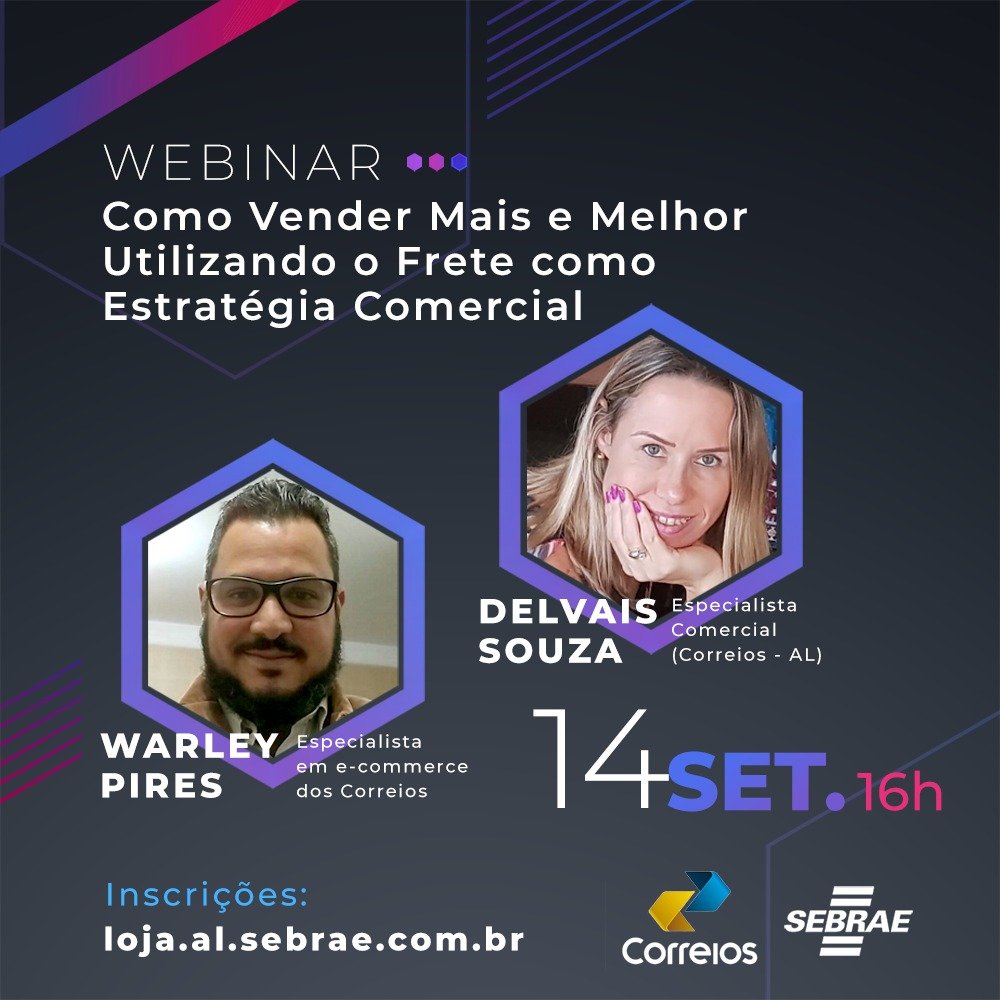 Para o evento, o Sebrae Alagoas convidou dois especialistas da Empresa Brasileira de Correios e Telégrafos (Correios) para que possam apresentar estratégias de transporte de mercadorias aplicáveis aos pequenos negócios. Além do especialista em e-commerce dos Correios, Warley Pires, também participará do webinar a especialista comercial da unidade local dos Correios, Delvais Souza.