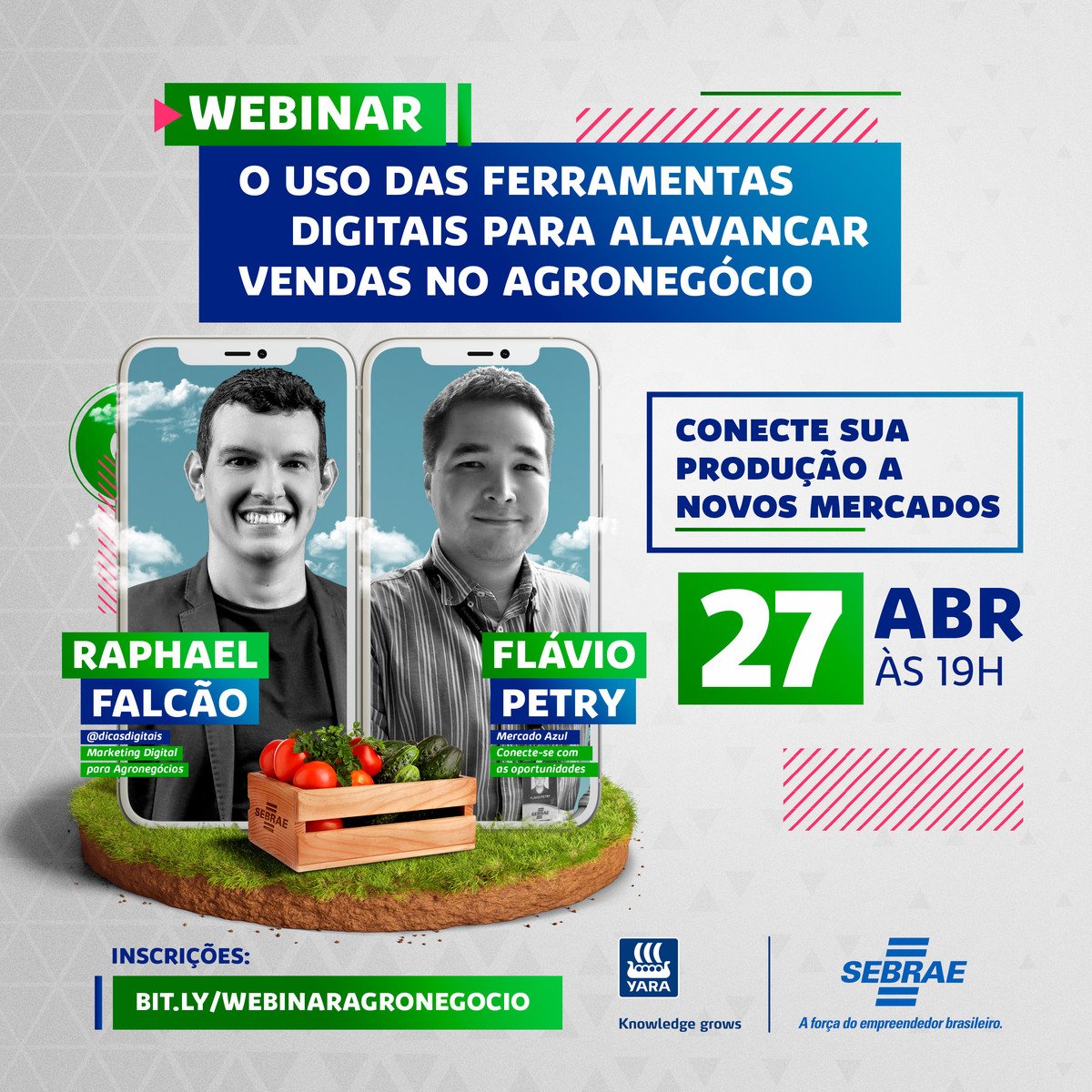 As inscrições para o webinar ‘O uso das Ferramentas digitais para alavancar vendas no agronegócio’ são gratuitas e podem ser feitas através do site: https://mkt.blog.sebraealagoas.com.br/webinar-agronegocio-abril-2021. O evento é promovido em parceria com a Yara Brasil.