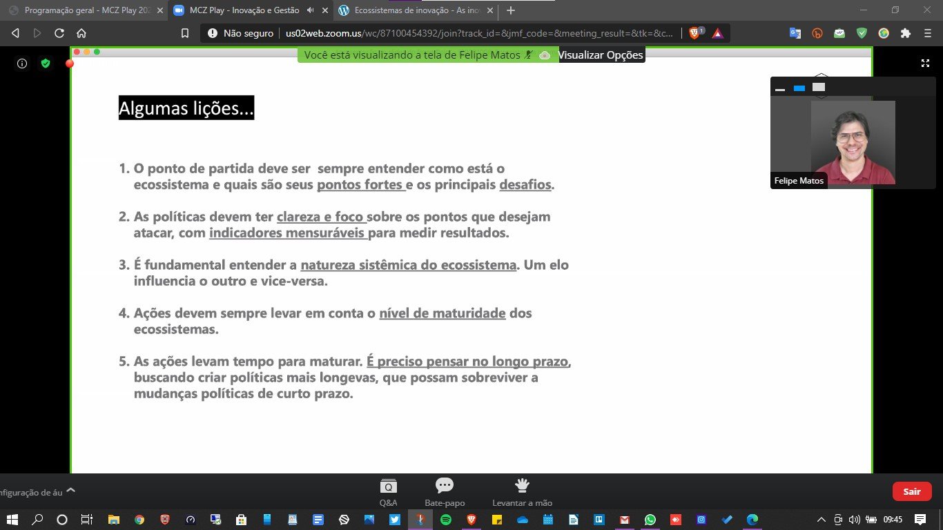 Durante o webinar, Felipe Matos pontuou alguns casos internacionais de boas práticas de inovação, como o Vale do Silício e Israel, Waterloo, Blackberry e Nokia, a Estônia e a digitalização, e o Marco Legal das startups italianas. O conteúdo da apresentação pode ser baixado no link https://airtable.com/shrkwhFqBHHQlQe24