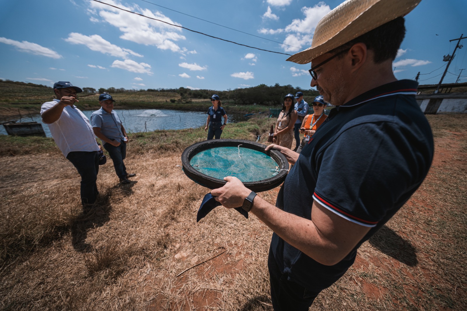 As visitas de campo a propriedades produtoras de camarão em Arapiraca, Igaci e Coité do Noia foram acompanhada por representantes das instituições parceiras, como Gisele Duarte, coordenadora do PCT pela FAO; Anderson Antonello, coordenador geral de Desenvolvimento da Aquicultura do Ministério da Pesca e Aquicultura (MPA); e Cláudio Pinheiro, diretor de ATER no Instituto BioSistêmico (IBS), criador do aplicativo responsável pelos diagnósticos.