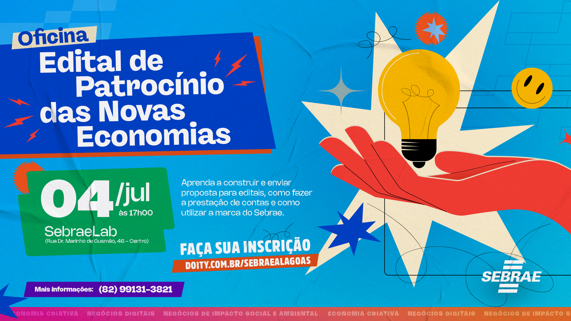O Sebrae Alagoas vai promover nesta terça-feira (4), às 17h, uma oficina voltada para o Edital de Patrocínio para Eventos das Novas Economias. O evento tem por objetivo ensinar clientes a submeter projetos ao edital, explicar sobre a prestação de contas dos recursos e a utilização da marca Sebrae.