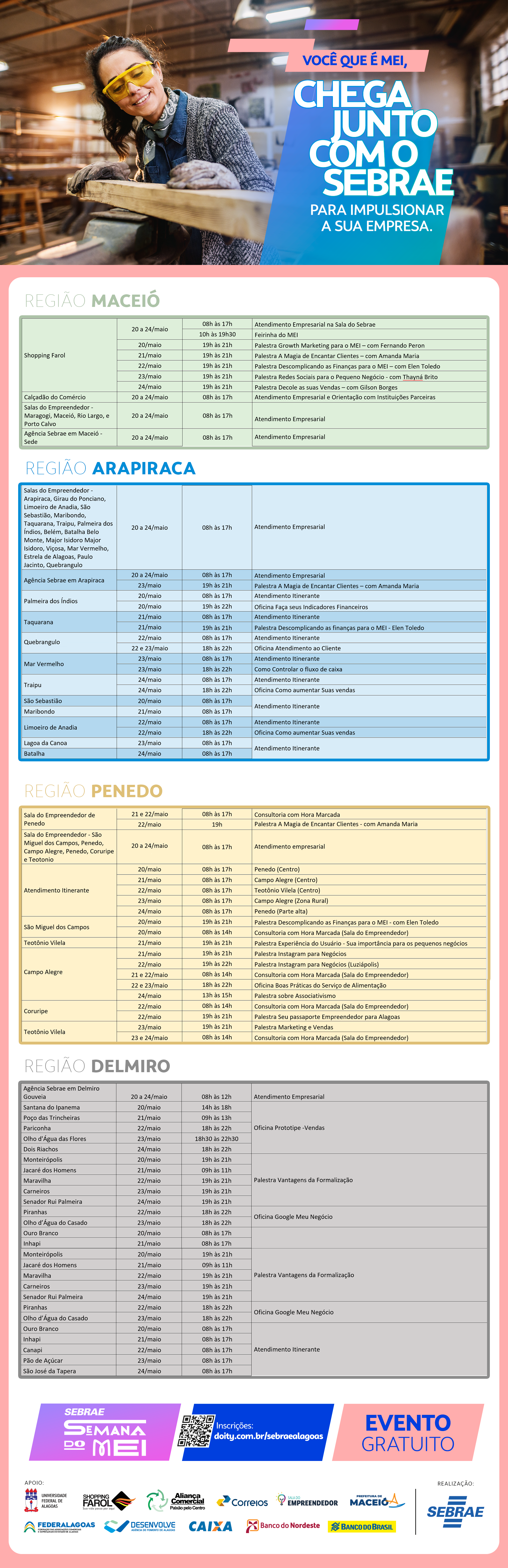 Os empreendedores de Maceió, Arapiraca, Penedo e Delmiro Gouveia vão contar, de 20 a 24 de maio, com uma série de atividades gratuitas promovidas pelo Sebrae Alagoas durante mais uma edição da Semana do MEI. Palestras, oficinas, consultorias com hora marcada, cursos e seminários são algumas das ações previstas na programação oficial. As inscrições podem ser feitas pela página de eventos da instituição na plataforma doity, clicando aqui.